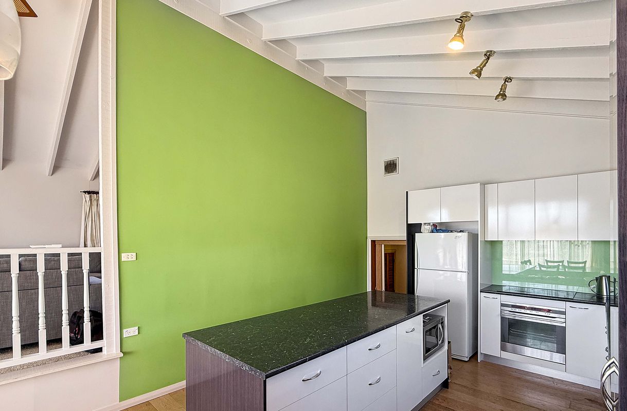 The home's architectural allure is exemplified by the high raked ceilings with striking exposed beams, infusing a sense of grandeur into the living spaces. A sun-drenched north-facing lounge room provides a warm and inviting area for relaxation, while the split-level design adds character and separation to the home's layout—features that enhance tenant comfort and retention.